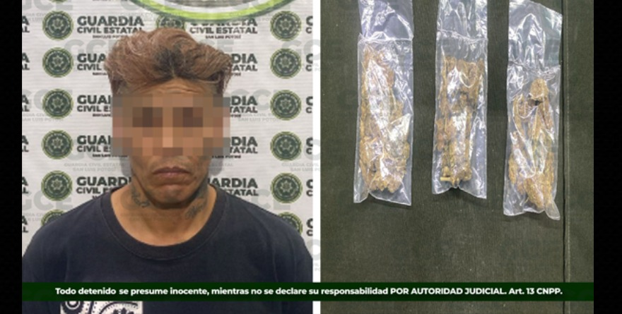 En la Huasteca, específicamente en San Martín Chalchicuautla, fueron detenidos un adolescente de 17 años y Prisciliano “N”, de 28, a quienes les aseguraron 70 bolsitas con marihuana, 76 dosis de sustancia similar al cristal y hasta una camioneta. Un combo que, según autoridades, confirma actividad de narcomenudeo en la región.