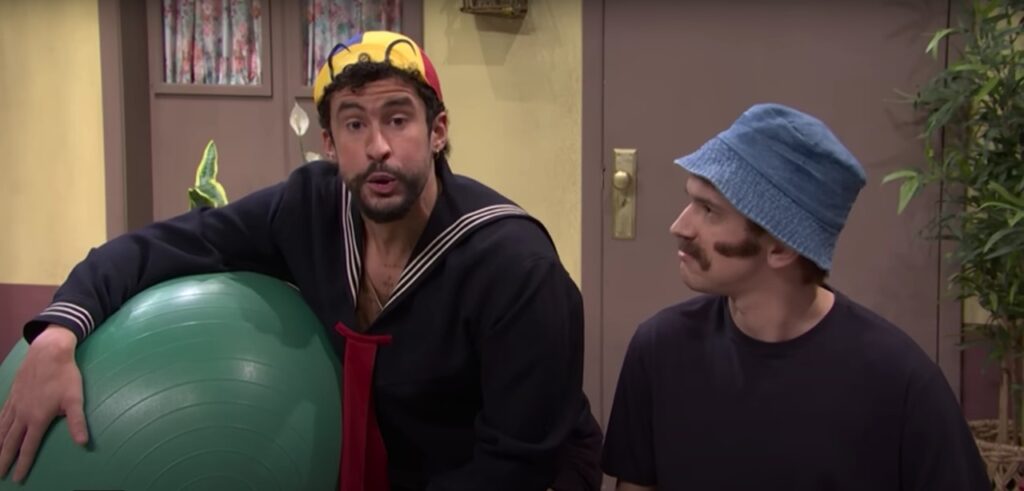 En la parodia, Bad Bunny dio vida a Quico, luciendo su característico gorro de marinero, cachetes inflados y gestos exagerados, mientras que Hernández se transformó en El Chavo, con gorro con orejeras y tirantes naranjas.