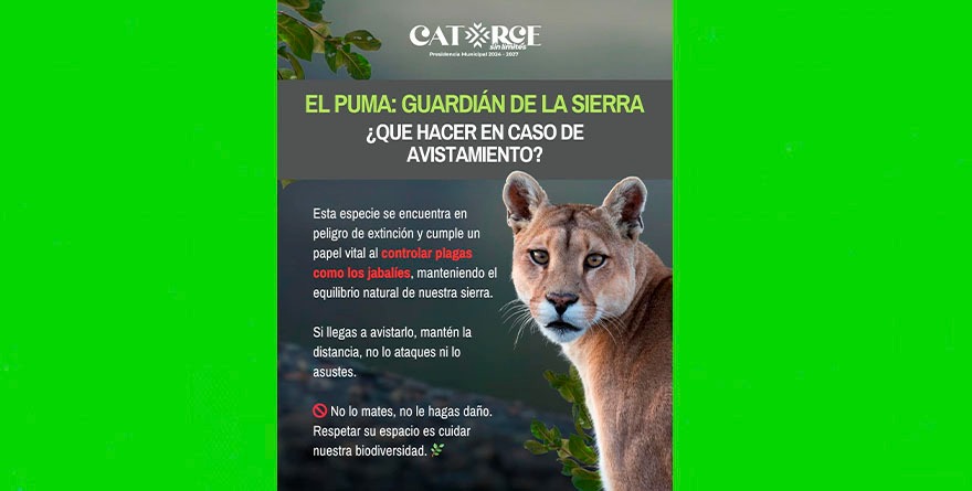 CATORCE, S.L.P. — En la Sierra de Catorce, el rugido del puma no es leyenda: sigue vivo, fuerte y, sobre todo, en peligro. Por eso, las autoridades municipales encendieron la alerta y pidieron a la banda serrana no meterse con el “rey del monte”, ese felino que mantiene el equilibrio natural cazando jabalíes, venados y otras especies que podrían alterar el ecosistema si se multiplican sin control.