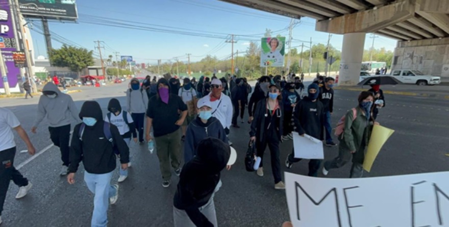 Estudiantes de la Universidad Autónoma de San Luis Potosí (UASLP) provocaron un severo caos vial en distintos puntos de la capital potosina con bloqueos en las más importantes arterias como avenida Chapultepec, tramos del Circuito Potosí y la glorieta Bocanegra, en protesta por la violenta agresión cometida por un docente en contra de una ex alumna.