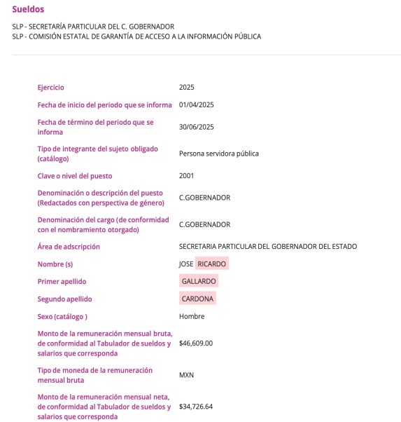 La información fue verificada en la página de transparencia, donde se confirma que su salario mensual bruto es de 46,609 y el neto de 34,726 pesos.