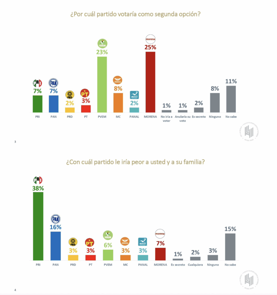Y es que no sólo lideran en intención de voto. El PVEM también es el partido que más potosinos ven como el que va a ganar sí o sí, con un 46% de menciones, y además, es segunda opción para el 23% de los encuestados. O sea, aunque no voten de primera por ellos, hay un buen porcentaje que sí los tiene en el radar como “el plan B”.