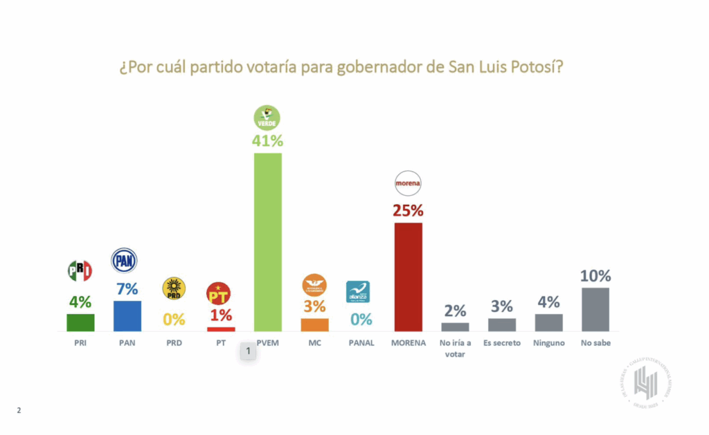 San Luis Potosí, SLP.– El Partido Verde Ecologista de México (PVEM) está rompiendo la liga en San Luis Potosí, y no lo dice el chisme de pasillo, lo dice una de las encuestadoras más serias del país: De las Heras Demotecnia. Según su más reciente estudio, el Verde lidera las preferencias con un 41% de intención de voto, dejando muy atrás a Morena (25%) y haciendo ver chiquito al PAN, que apenas y llega al 7%.