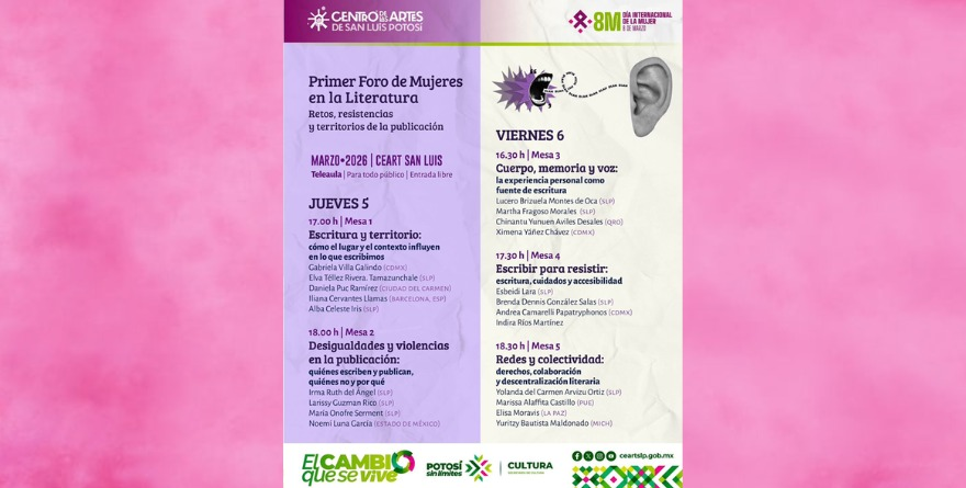 En el marco del Día Internacional de la Mujer, el Gobierno del Estado, a través del Centro de las Artes de San Luis Potosí (CEART) y en colaboración con Editorial Letra Púrpura, llevará a cabo el Primer Foro de Mujeres en la Literatura: “Retos, resistencias y territorios de la publicación”, un espacio de diálogo y reflexión sobre el papel de las mujeres en el ámbito literario.