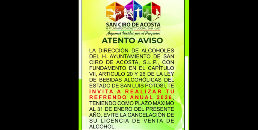 La Dirección de Alcoholes del Ayuntamiento de San Ciro de Acosta hizo un llamado a los comerciantes que cuentan con autorización para la venta de bebidas alcohólicas, a acudir a realizar el refrendo de sus permisos para el año 2026.