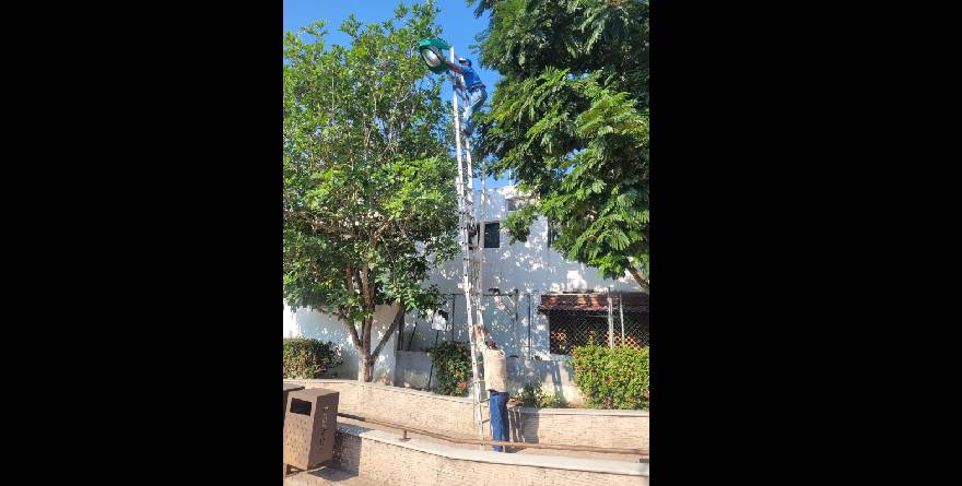 Así lo advirtieron fotografías que el mismo edil público en Facebook, donde se muestran empleados cambiando luminarias sin casco de seguridad, sin guantes y haciendo malabares con el riesgo de perder la vida.