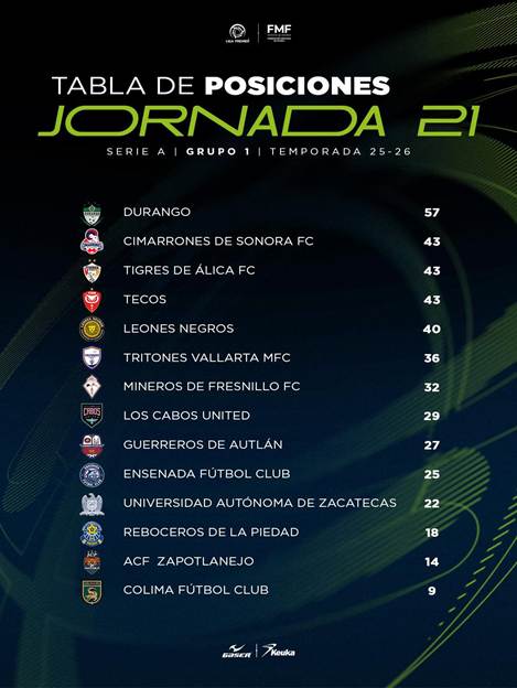 Con 57 puntos, el conjunto duranguense encabeza su sector, respaldado por una contundente diferencia de goles de +40, producto de 50 anotaciones a favor y apenas 13 en contra.