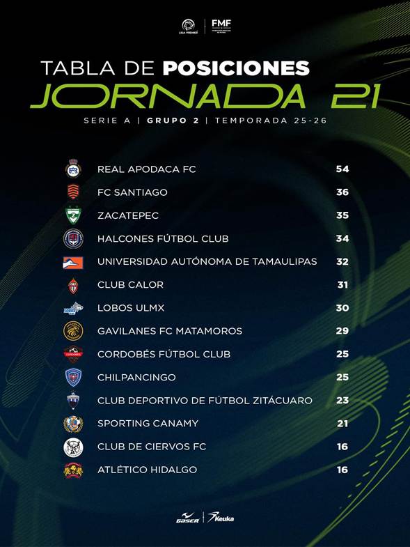 Real Apodaca FC demostró que es un serio candidato al título, ya que en la Jornada 21 dio un golpe sobre la mesa al derrotar 3-0 a Halcones FC con lo que ya está a nada de asegurarse el primer lugar y poderse saltar la reclasificación.