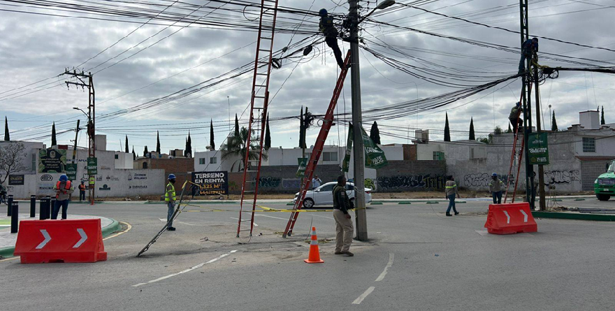 Este jueves, elementos de la Dirección de Vialidad de la Guardia Civil Municipal implementaron un dispositivo de apoyo en la zona de la glorieta de la Vía Alterna Oriente, mientras cuadrillas de la CFE realizan maniobras para retirar y reubicar la infraestructura eléctrica.