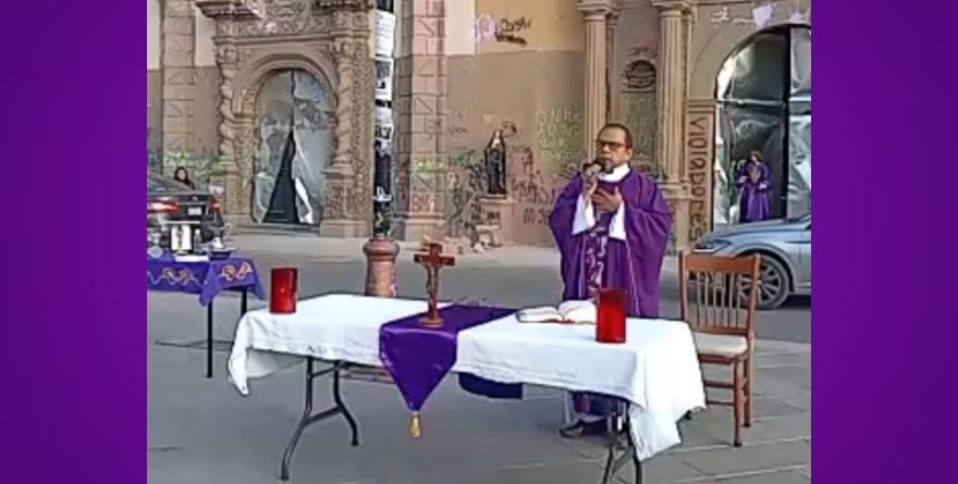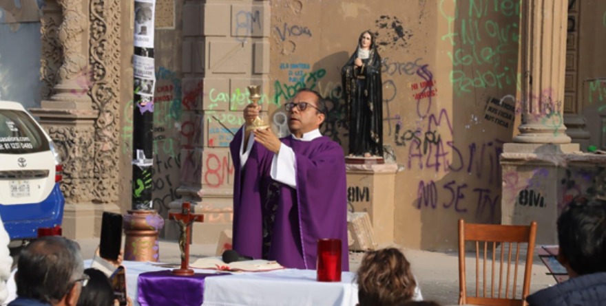 Fue a las 8:00 de la mañana cuando el padre Jorge Aurelio Ramírez Torres inició la celebración eucarística en la explanada, ya que el interior del templo quedó en malas condiciones para realizar las actividades religiosas tras los destrozos y pintas registrados la noche anterior.