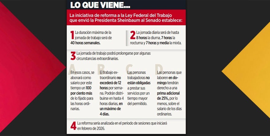 Ciudad de México diciembre 2’025.- El Gobierno federal acordó con el sector privado y con las centrales obreras una reforma para reducir la jornada semanal de trabajo de 48 a 40 horas, mediante un esquema gradual que iniciará en 2027 y concluirá en 2030.