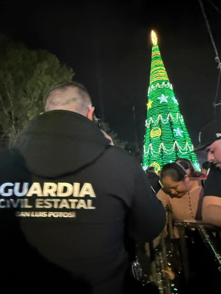 Durante el encendido del árbol monumental en Villa de Pozos, la guardia civil municipal en coordinación con guardia civil estatal implementaron un operativo de vigilancia y apoyo para garantizar que las familias asistentes disfrutaran del evento en un entorno ordenado y seguro. La presencia de elementos en puntos estratégicos permitió mantener el flujo peatonal, atender incidentes menores y reforzar la prevención ante la alta afluencia registrada en la Plaza Principal, uno de los espacios más concurridos durante la temporada decembrina.